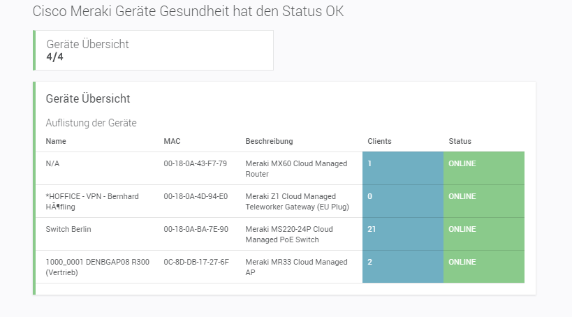 Cisco Meraki ermöglicht die Verwaltung vieler unterschiedlicher Geräte (WAN, LAN, WLAN) in einem Dashboard. Durch unseren Sensor habt Ihr den Gerätestatus immer im Blick und darüber hinaus die Möglichkeit, Geräte von der Prüfung auszuschließen.