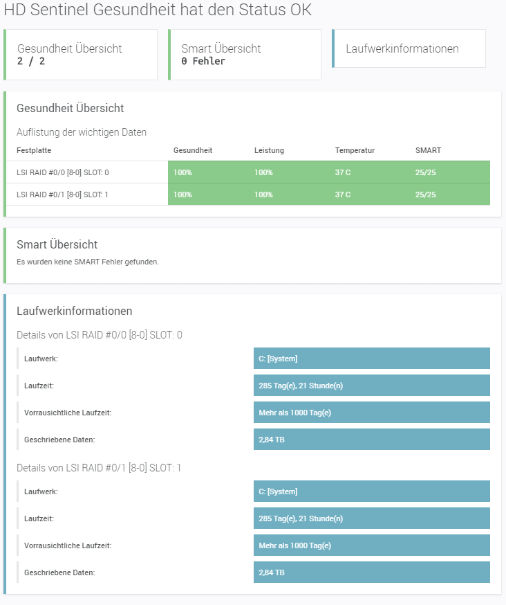 Eines der wenigen Tools für Windows, welches SMART Werte auch für bekannte RAID Controller auswertet, ist HD Sentinel. Das beliebte Tool bietet dabei viele Monitoring-Werte für die Festplatte an, welche wir nun mit einem eigens dafür entwickelten Sensor abgreifen und zur Verfügung stellen können. Dabei wird auch die Performance einer Festplatte ausgewertet.