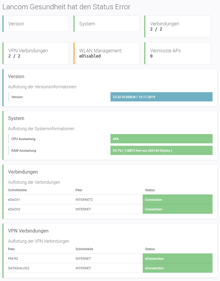 In Zusammenarbeit mit unseren Partnern und durch Mithilfe des Herstellers können wir unser Portfolio um einen tollen Sensor erweitern. Der Sensor überprüft Auslastungswerte wie CPU/RAM, den Status von Interfaces/Connections und VPN Tunnel und überwacht darüber hinaus wichtige WLAN Funktionen (Vermisste APs, Status).