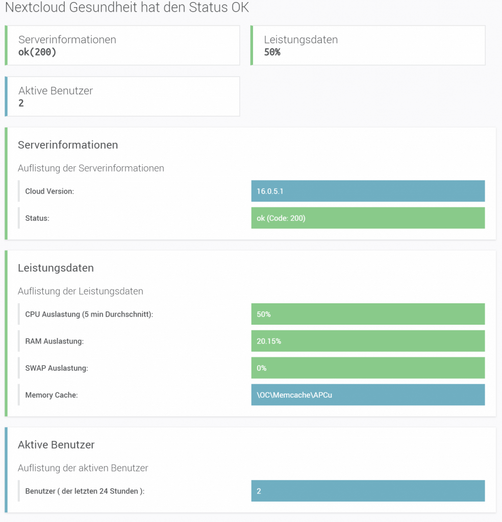 Unser Sensor für Nextcloud überprüft wichtige Performancewerte des Servers, wie CPU, RAM oder SWAP, auf Auslastung. Ergänzt wird das Ganze durch nützliche Messwerte wie beispielsweise die Information, wie viele Benutzer in den letzten 24 Stunden eingeloggt waren.