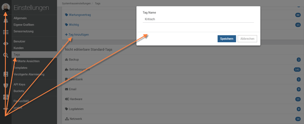 Als Systemhauspartner stehen Ihnen im OCC in den Systemhaus- Einstellungen die Optionen „Tags“ und „gefilterte Ansichten“ zur Verfügung. Unter dem Reiter  „Tags“ erstellen wir nun zuerst die Tags „Kritische Alarme (Rot)“ bzw. kurz „kritisch“ und „wichtige Alarme (Gelb)“ bzw. kurz „wichtig“. Mit Hilfe der Bulk- Zuweisung von Tags über unsere Suche weisen Sie die angelegten Tags nun allen Sensorhubs und Sensoren zu.