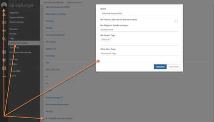 Sind die Tags angelegt und allen Ebenen im OCC korrekt zugewiesen, ist der aufwendige Teil geschafft. Unter dem Menüpunkt „gefilterte Ansichten“ in den Systemhauseinstellungen erstellen Sie nun die zwei Ansichten „kritische Alarme“ und „wichtige Alarme“. In den beiden Ansichten wählen Sie als Tags jeweils die Tags „kritisch“ und „wichtig“ aus. Nun sind die Ansichten global definiert und können von jedem Ihrer servereye Accounts benutzt werden.