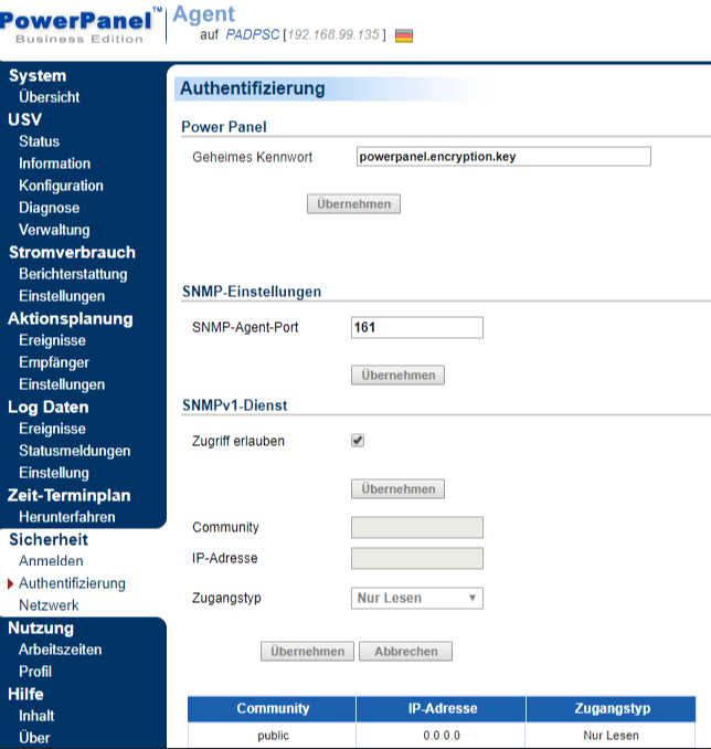 In der PowerPanel Software erfolgt die Konfiguration über die Oberfläche der Software. Unter dem Punkt Sicherheit?Authentifizierung lässt sich SNMPv1 aktivieren.