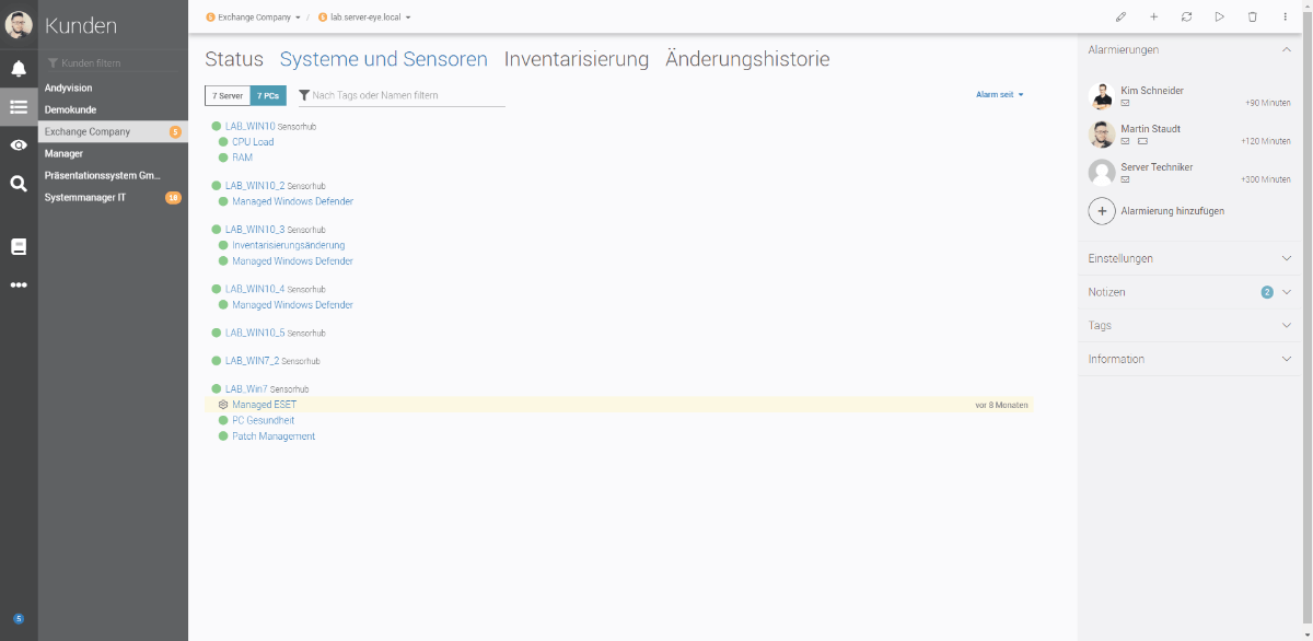 Die eingetragenen Alarmierungen stehen nun im Hauptfokus und sind präsent auf den ersten Blick erkennbar. Unterhalb der Alarmierungen finden Sie die Sensoreinstellungen, die eingetragenen Notizen, die gesetzten Tags und die Informationen zum ausgewählten Sensor oder Sensorhub.