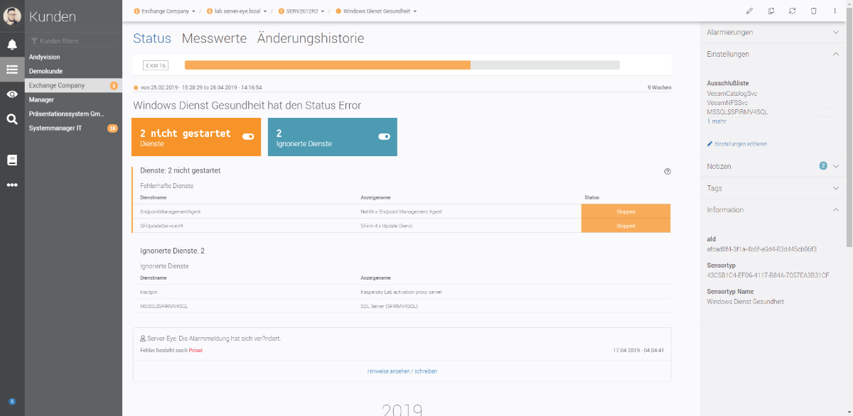 Auch die Sensoren wurden überarbeitet und bieten Ihnen nun die neuen interaktiven Sensortemplates. Mit Hilfe der neuen Informationskacheln sehen Sie auf einen Blick, wo die aktuellen Probleme liegen, z.B zwei nicht gestartete Dienste und können über die bereits aus Windows 10 bekannten Toggles nicht benötigte Informationen ausblenden. Für die Top Sensoren, die am meisten bei allen Partnern eingesetzt werden, stehen die neuen Templates ab dem kommenden servereye Juni Update bereit. Im Laufe der nächsten Updates werden nach und nach alle weiteren Sensoren auf die neuen Templates umgestellt.