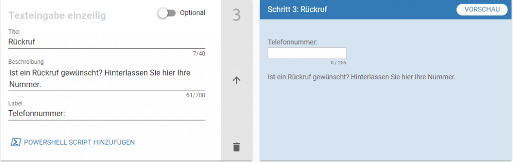 Das Design solcher Formulare sollte nicht außer Acht gelassen werden. Mit dem „Markdown“ ist eine Überschrift, ein Link zur Fernwartung oder eine Telefonnummer zur Direkt Wahl in den Texten der Formulare möglich. Selbstverständlich haben wir hier noch weitere Szenarien, die sich abbilden lassen.