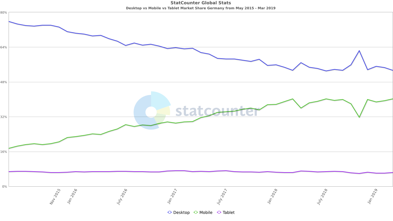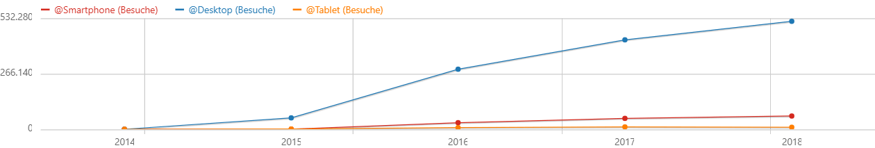 Lag der Anteil der Desktop-User im Jahre 2015 noch bei einem Rekordhoch von 96,7%, so liegt er Ende 2018 bei etwa 87,1%. Gleichzeitig stieg analog dazu auch der Teil der Smartphone User von etwa 1,2% auf ganze 10,7% an. Erstaunlich gering blieb der Anteil an Tablet-Nutzern. Kamen 2015 nur etwa 1,9% der Aufrufe von einem Tablet, so lag der Höchstwert im Jahr 2016 bei nur etwa 2,4%. Seitdem sinkt dieser Wert kontinuierlich und befindet sich aktuell bei etwa 1,6%.