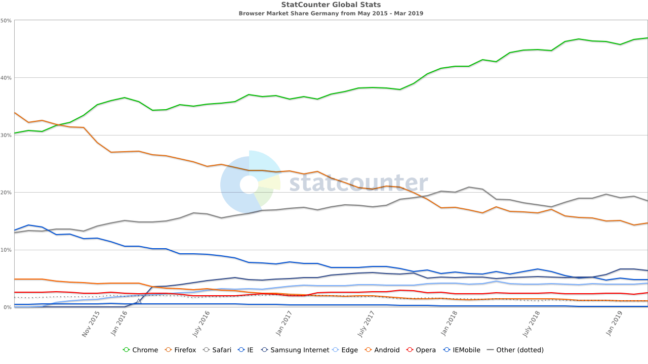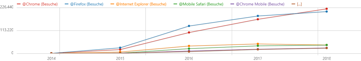 Konträr zu den deutschlandweiten Statistiken wurde Firefox (34,8%) erst 2018 von Chrome (37%) überholt. 2015 setzte sich Firefox noch ganz klar als beliebtester Browser (48,8%) vom zweitplatzierten Chrome (32,9%) ab. Der Feind eines jeden Webentwicklers – der Internet Explorer – sank mit einem Anteil von 11,7% in 2015 mittlerweile auf 6,9% in 2018, womit er aber immer noch einen höheren Nutzeranteil als sein jüngerer Bruder Edge (4,4%) aufweist.