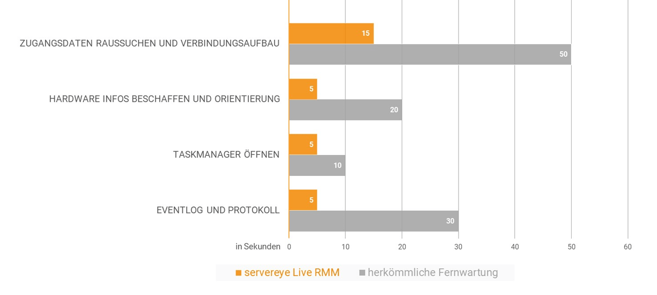 Live Manager hat die Art und Weise, wie IT-Support geleistet wird, revolutioniert. Neben der deutlichen Zeitersparnis (siehe Grafik 1), wird auch die Arbeit eines Supporters nachhaltig verbessert. Die Möglichkeit, administrative Aufgaben im Hintergrund durchzuführen, ohne den Anwender zu stören, verschafft dem Supporter die notwendige Unabhängigkeit, um Anfragen schneller und präziser zu bearbeiten. Mit servereye als zentrales Cockpit ermöglicht er, sich auf strategischere und wertvollere Aufgaben zu konzentrieren, anstatt Zeit mit reaktiven Problemlösungen zu verschwenden.